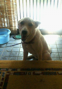 さらに嫌がって私の足元に隠れた。紐が絡んで動けない。ジュンタびくびく。看護婦さん「お姉さん、ワンちゃんのお顔を持ってくださいね」ジュンタ私の足元から逃げる。脱走したいみたい。