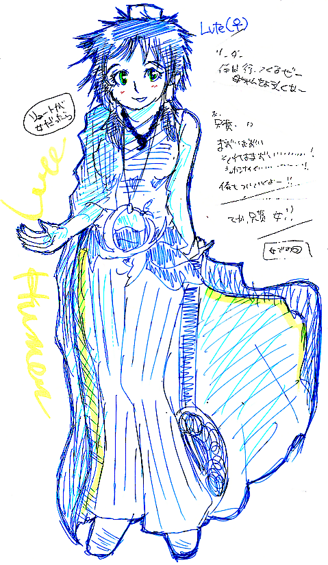 リュート:大学を2浪している。楽器が得意でのんびりしている。風呂に入る概念がない。ブルー・レッド・クーンはいい人、エミリア・アセルス・T260は一方的に知っている。大酒のみ。ニートなので体力は低いが、センスはいい。親に「大学は出ときなさい」といわれている。が、子供とか老人とかにはよく懐かれている。